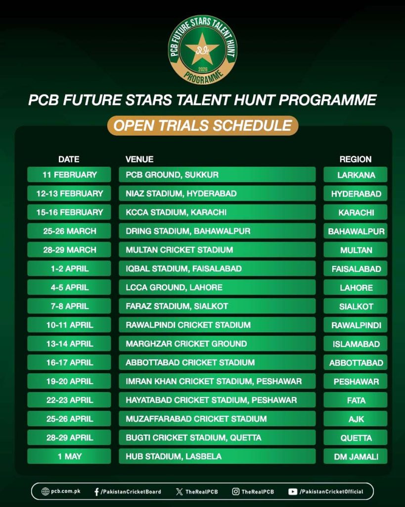 سلیکشن کیلئے ملک بھر کے نوجوان کھلاڑیوں کی 11 فروری سے یکم مئی تک ملک کے مختلف شہروں میں اوپن ٹرائلز ہوں گے، عاقب جاوید، مصباح الحق اور عبدالرزاق سمیت ریجنل کوچز پر مشتمل سلیکشن پینل اوپن ٹرائلز لے گا۔